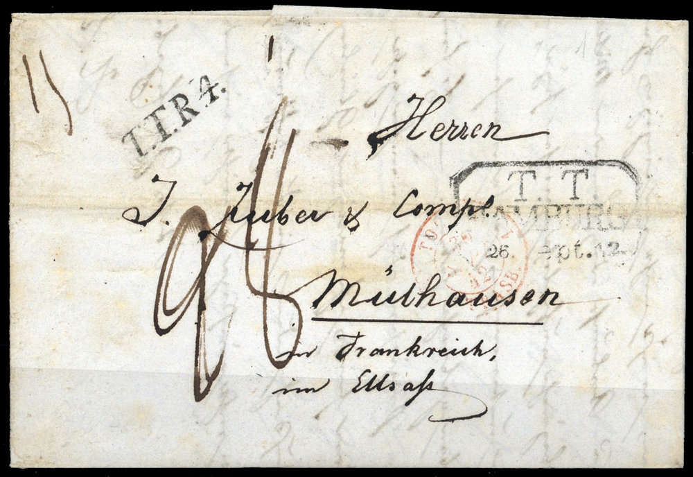 "HAMBURG T.T. 26.Sept.(18)42", Ra3 (Feu.1356-5), Brief mit Inhalt, waager. Faltung, Alters- Beförderungsspuren, Taxen, L1 "T.T.R.4.", Grenz-K2, nach Mülhausen/F