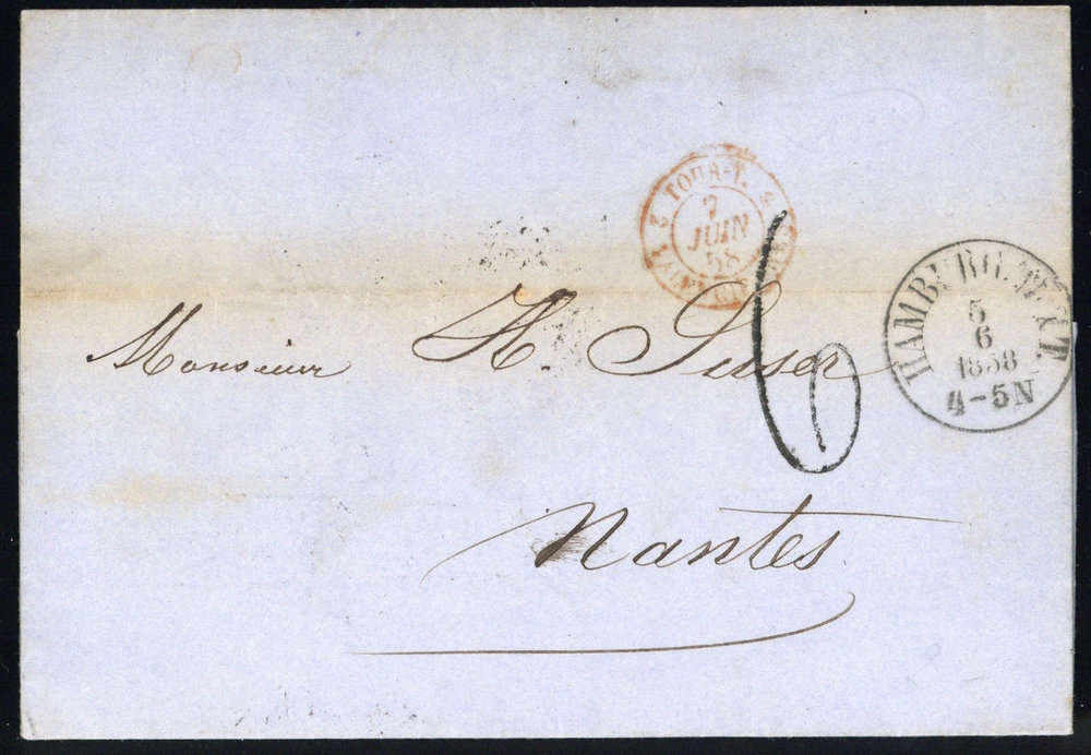 "HAMBURG TH.&.T. 5 6 1858", K1 auf Brief mit Inhalt, waager. Faltung, Taxe "6", roter Grenz-K2, Alters- Beförderungsspuren, nach Nantes