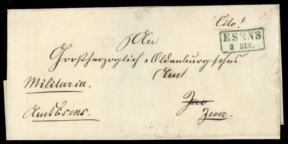 "ESENS 3 DEC.", grüner Ra2 auf Faltbrief (ohne Inhalt) nach Jever, rs. Ankunftsstpl. "JEVER 4.DEC:56", leichte Alterungsspuren.