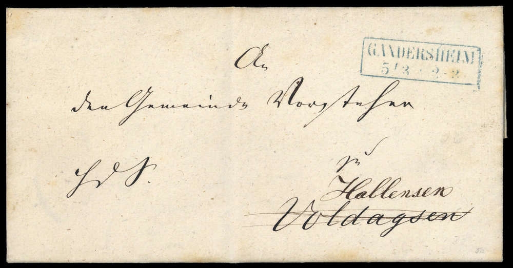 "GANDERSHEIM 5/3", blauer Ra2 auf Amtsbrief mit Inhalt von 1857, nach Hallensen