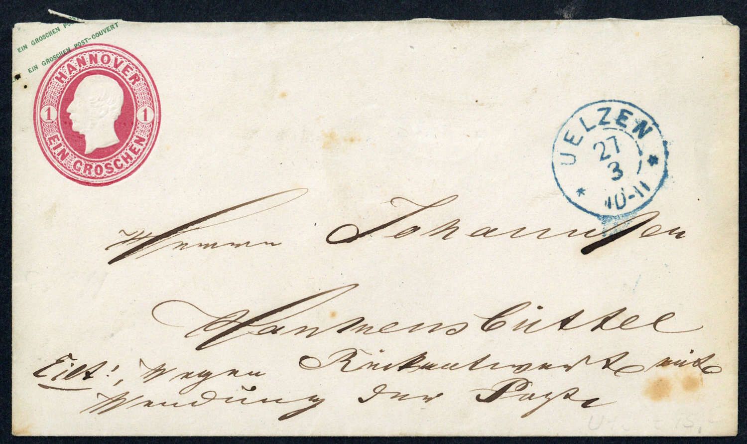 "UELZEN 27 3 10-11", blauer K2 auf 1 Gr. König-Ganzsachenumschlag, Alterungsspuren