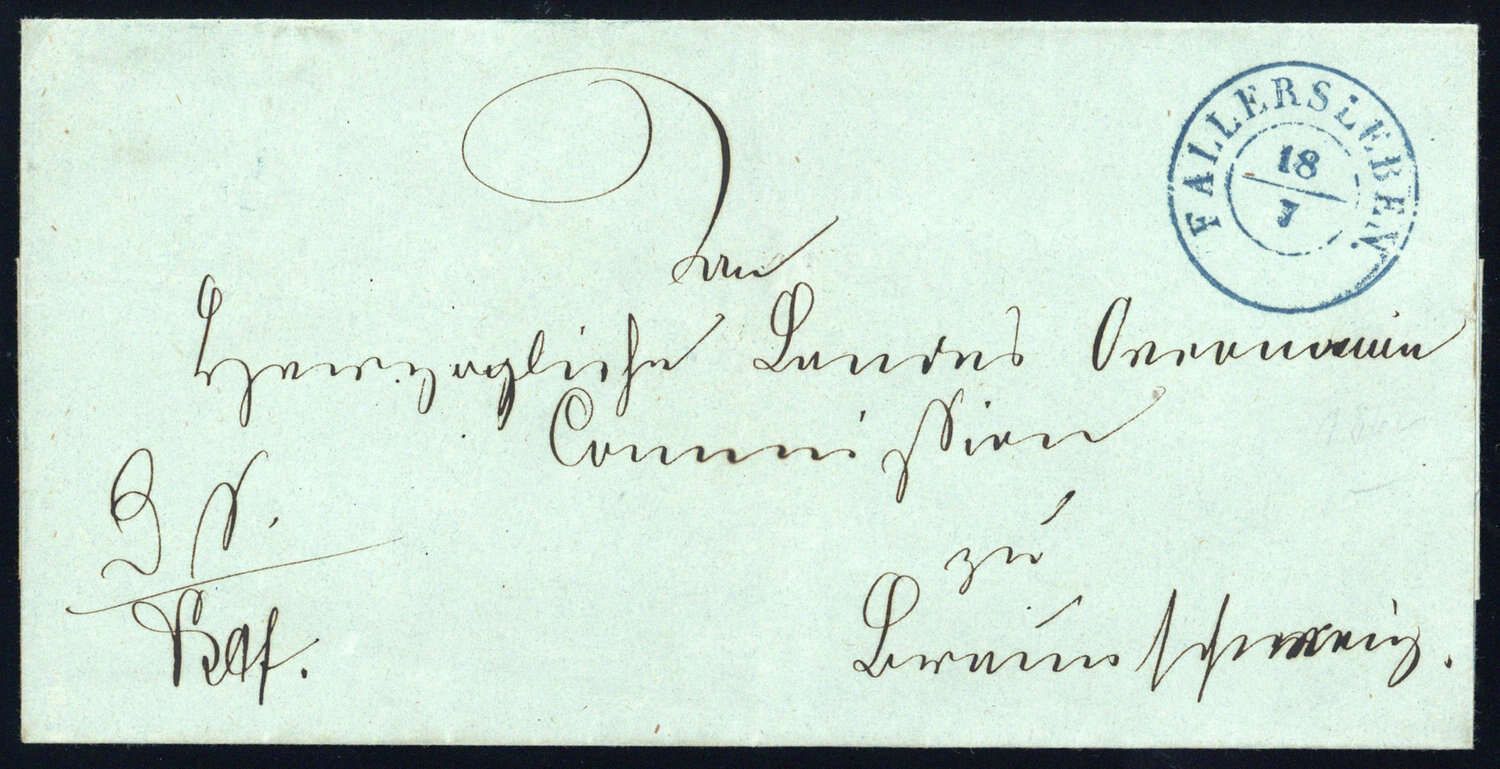 "FALLERSLEBEN 18/7 (ca. 1862)", blauer K2 auf Amtbrief, Beförderungs- Altersspuren, nach Braunschweig