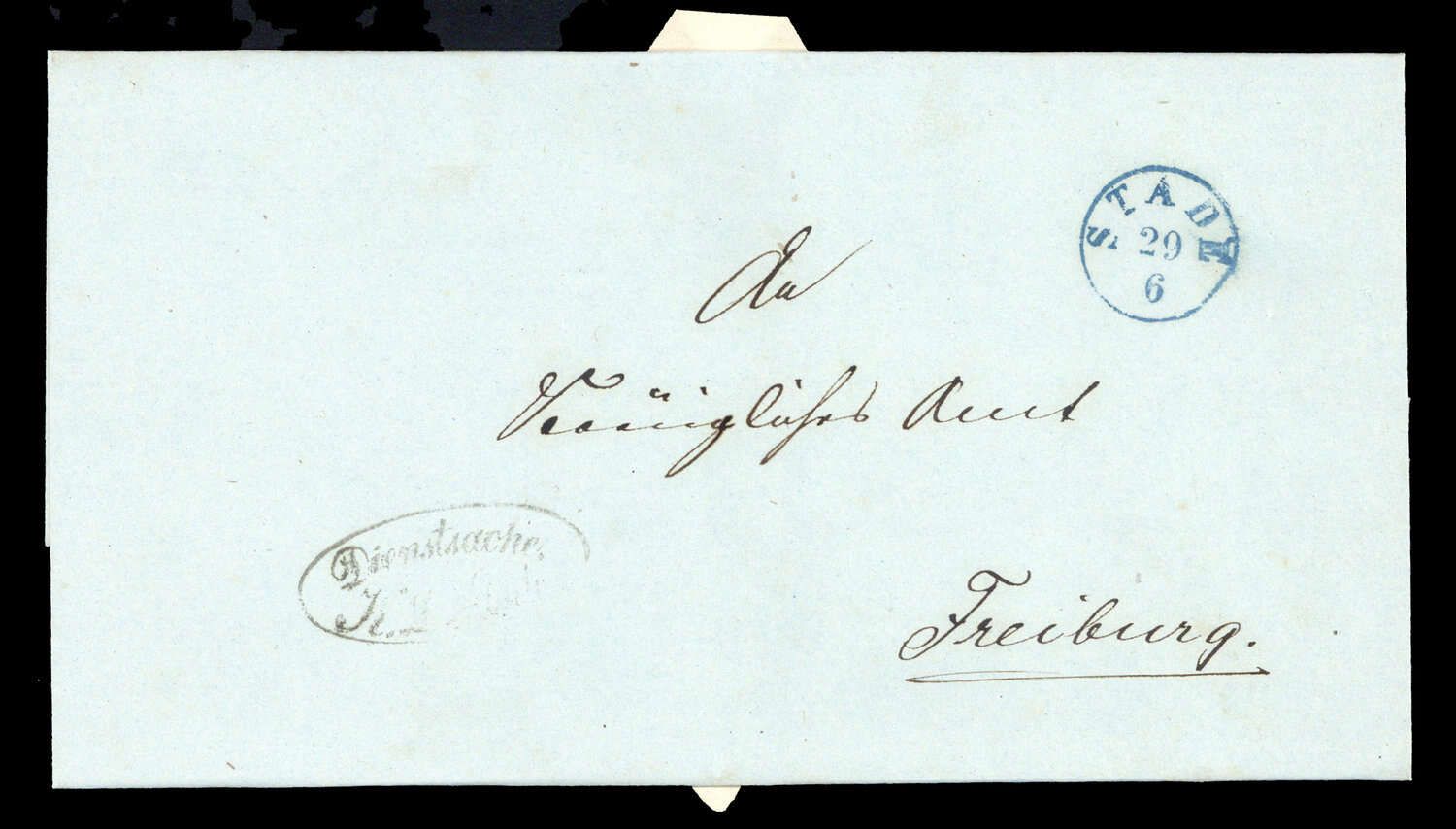 "STADE 29 6 (ca. 1866)", deutlicher blauer K1 auf Amtsbriefhülle, Nebenoval "Dienstsache ..", Alters- Beförderungsspuren, nach Freiburg