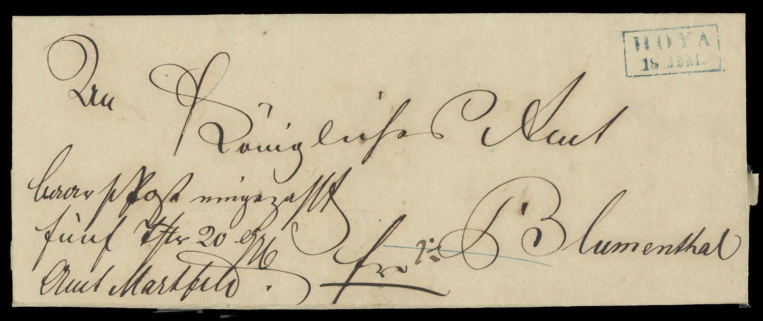 "HOYA 18. JUNI (1858)", deutlicher blauer Ra2 auf Dienst-Siegelbrief mit Inhalt, Beförderungs- Altersspuren, rs. blauer Ak-K2 "BLUMENTHAL ../6"