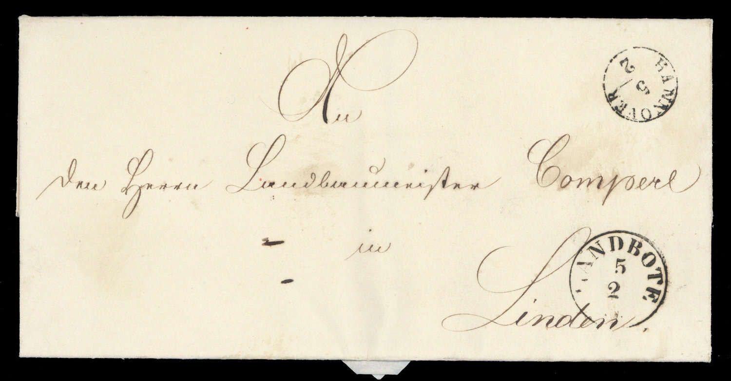 "HANNOVER 5/2", deutlicher K1 auf Siegelbriefhülle, ca. 1849, Neben-K1 "LANDBOTE 2 1 A", Beförderungsspuren