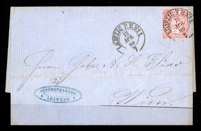 "LEIPZIG P.E.No.1 13 APR 69", klarer K2 auf Brief (Altersspuren, waagerechte Brieffaltung) mit 1 Gr. rot, unregelmässige Zähne, sowie dto. beigesetzt nach Wien