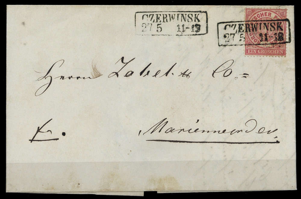 "CZERWINSK 27 5 (1869)", Ra2 auf 1 Gr karmin, Brief Beförderungs-, rs. Tesaklebespuren, nach Marienwerder