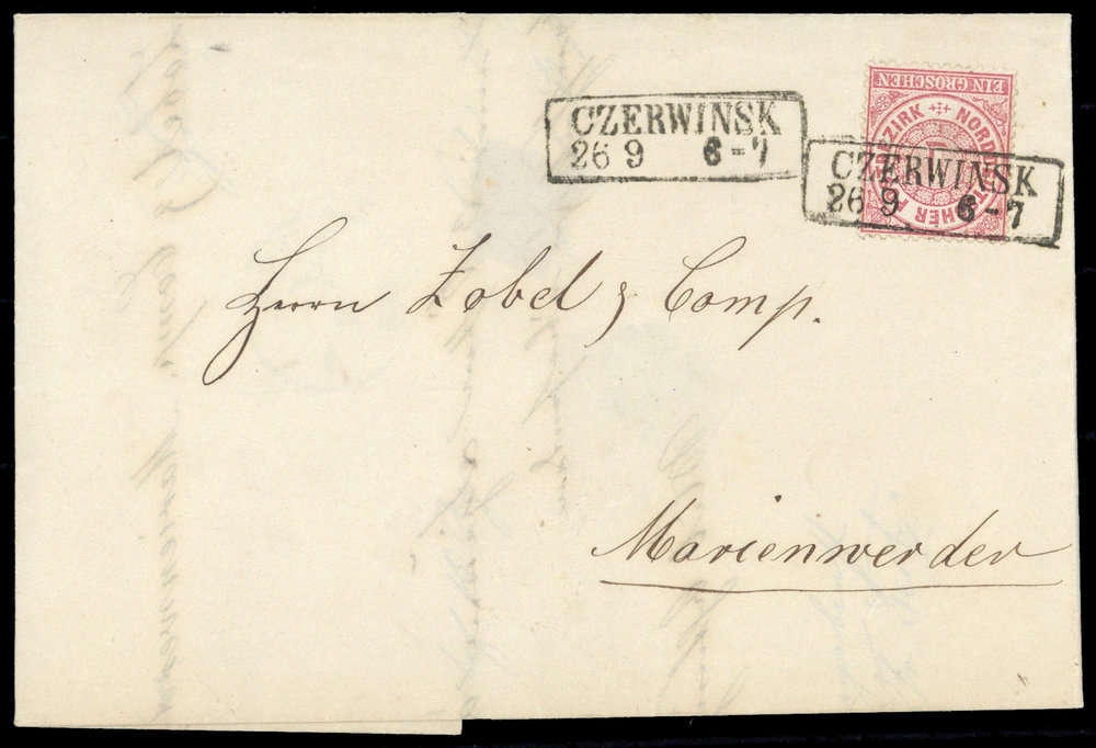 "CZERWINSK 26 9 (1869)", Ra2 auf 1 Gr karmin, Brief Beförderungs-, rs. Tesaklebespuren, nach Marienwerder