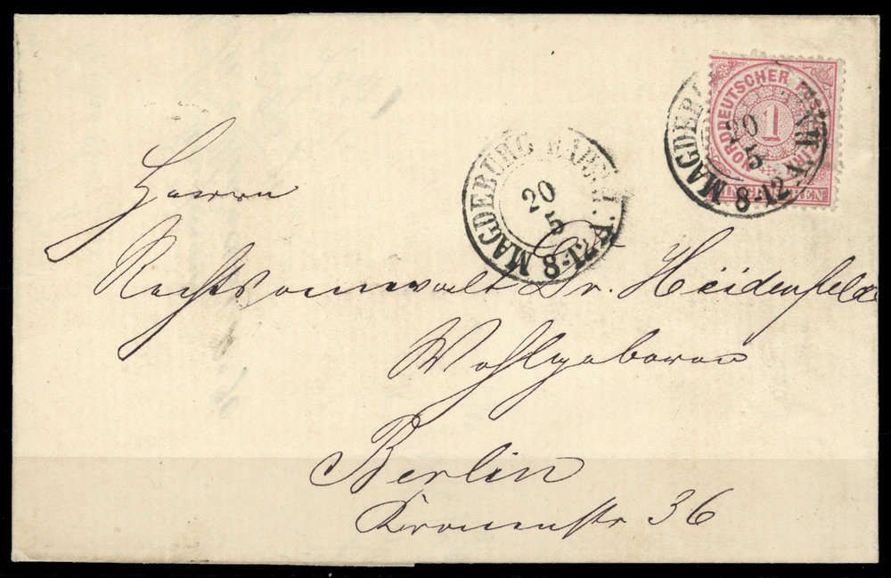"MAGDEBURG BAHNH. 20 5 (1870)", Ra3 auf 1 Gr karmin, sowie beigesetzt, auf Brief nach Berlin