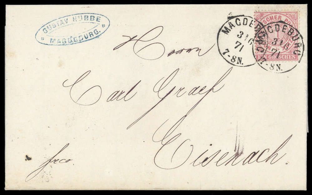 "MAGDEBURG 3/6 71", klarer K1 auf 1 Gr karmin, sowie beigesetzt, Brief rs. Ankunfts-Ra3 "EISENACH BAHNHOF 4 6 71"