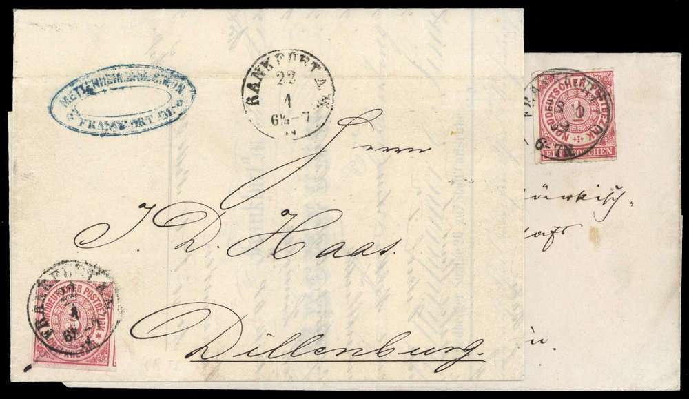 "FRANKFURT A.M. 22 1 (68), sowie A.O. 18 10 69", 2 Briefe (1 Brief Schrägschnitt), mit 1 Gr karmin, je Scherentrennung, Beförderungs- Altersspuren, nach Dillenburg bzw. Berlin