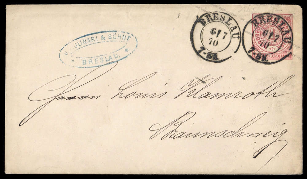 "BRESLAU 6/7 70 7-8N.", zweimal K2 auf 1 Gr. Ziffer Ganzsachenumschlag nach Braunschweig, rs. Ausgabe- und Briefträgerstpl., leichte Alterungsspuren.