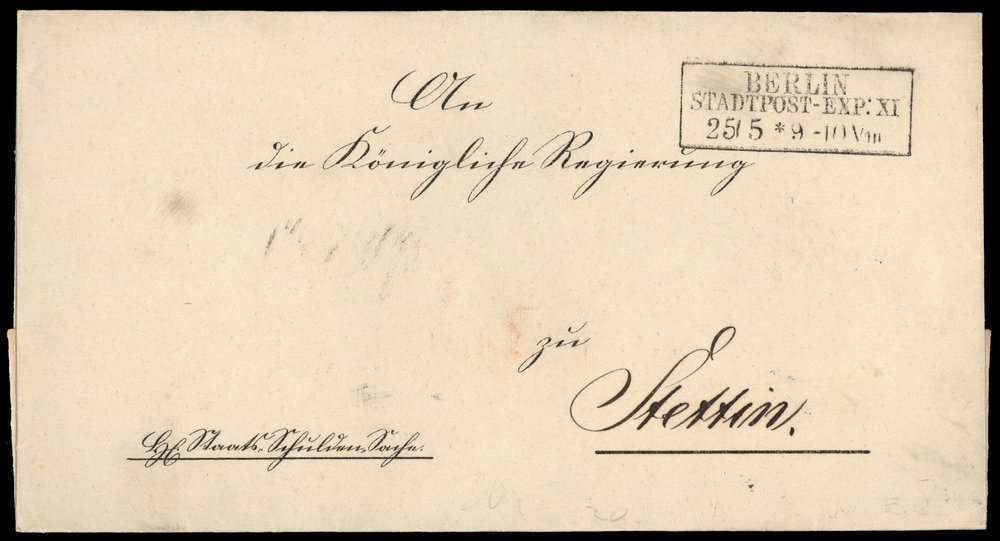 DIENST-Faltbrief ohne Inhalt mit Ra3 "BERLIN / STADTPOST-EXP:XI / 25/5 * 9-10 Vm" an die Kgl. Regierung nach Stettin, rs. Ausgabestpl. + Siegel, leichte Alterungsspuren.