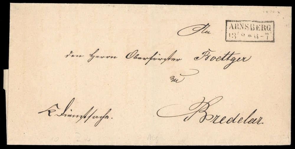 "ARNSBERG 13/8 * 6-7" (Ra2) auf Faltbrief ohne Inhalt nach Bredelar, rs. Ausgabestpl.