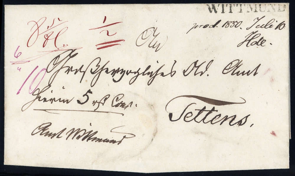 "WITTMUND", schwarzer Einzeiler auf Faltbrief (ohne Inhalt von 1850) nach Tettens, hds. Vermerke und rs. Siegel.