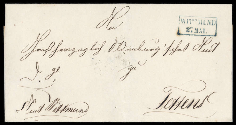 "WITTMUND 27 MAI.", grüner Ra2 auf Faltbrief (ohne Inhalt) nach Tettens, leichte Spuren, leichter senkrechter Bug.