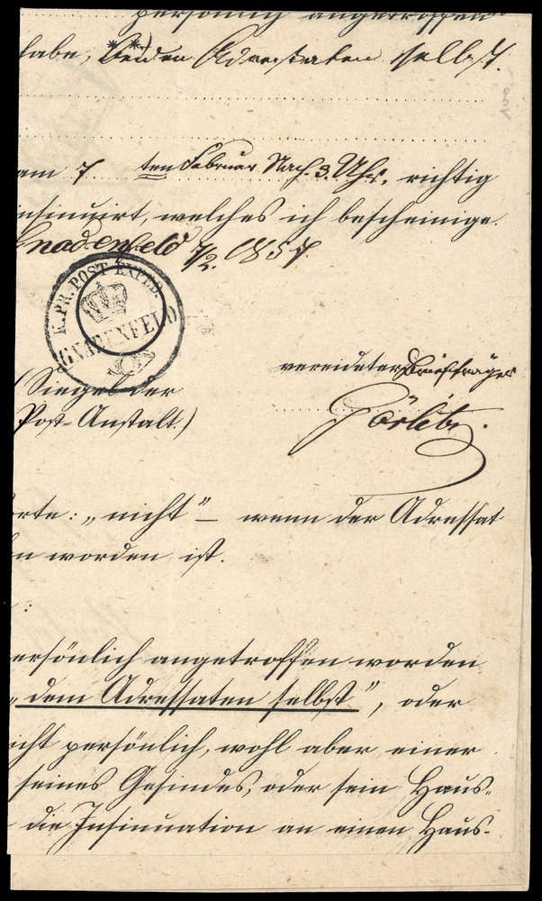 "COSEL 5 2 (1857)", Ra2 auf Gerichtsbrief, u.a. Ra2 "GNADENFELD 8 2", sowie Kronen-Posthorn-K1 "GNADENFELD K.PR.POST-EXPED.", Faltungen