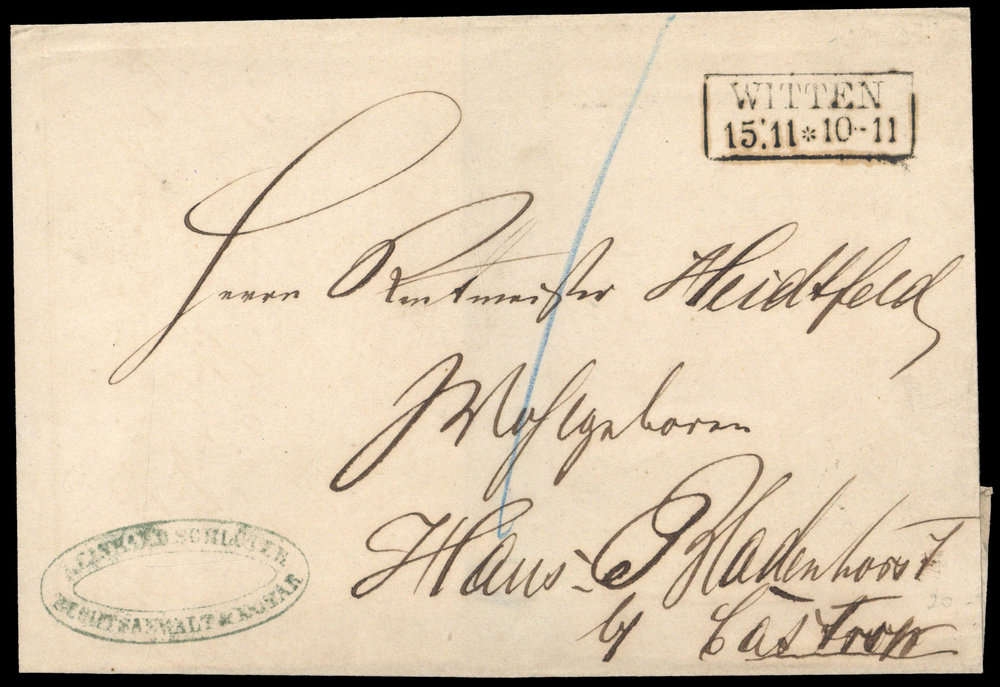 "WITTEN 15.11. (ca. 1860)", Ra2 auf Briefhülle, Beförderungs- Altersspuren, nach Bladenhorst