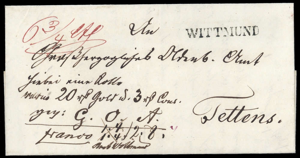 "WITTMUND", klarer L1 (Feu.3955-3), Siegelbrief mit Inhalt, Beförderungs- Altersspuren, hs. "franco", nach Tettens, Juli 1850