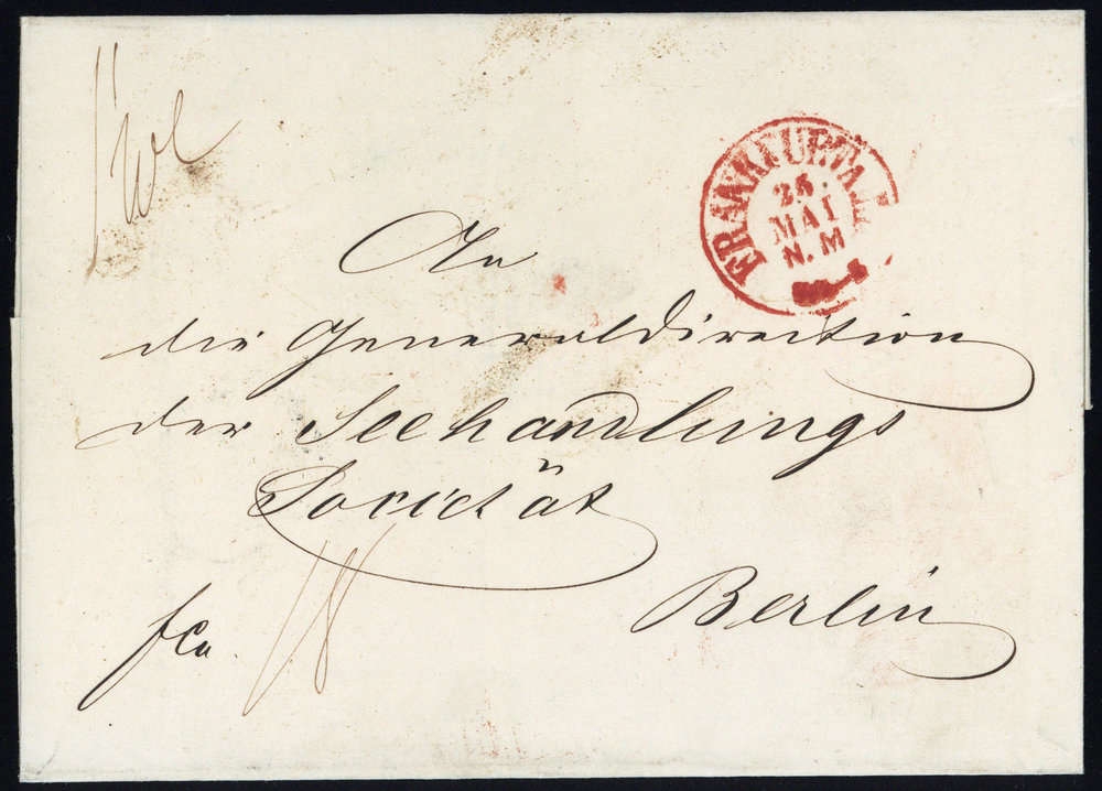"FRANKFURT A.M. 25 MAI", roter K1 auf Faltbrief, Taxe, rs. Ausgabe-K1 Berlin "27 5", Beförderungsspuren