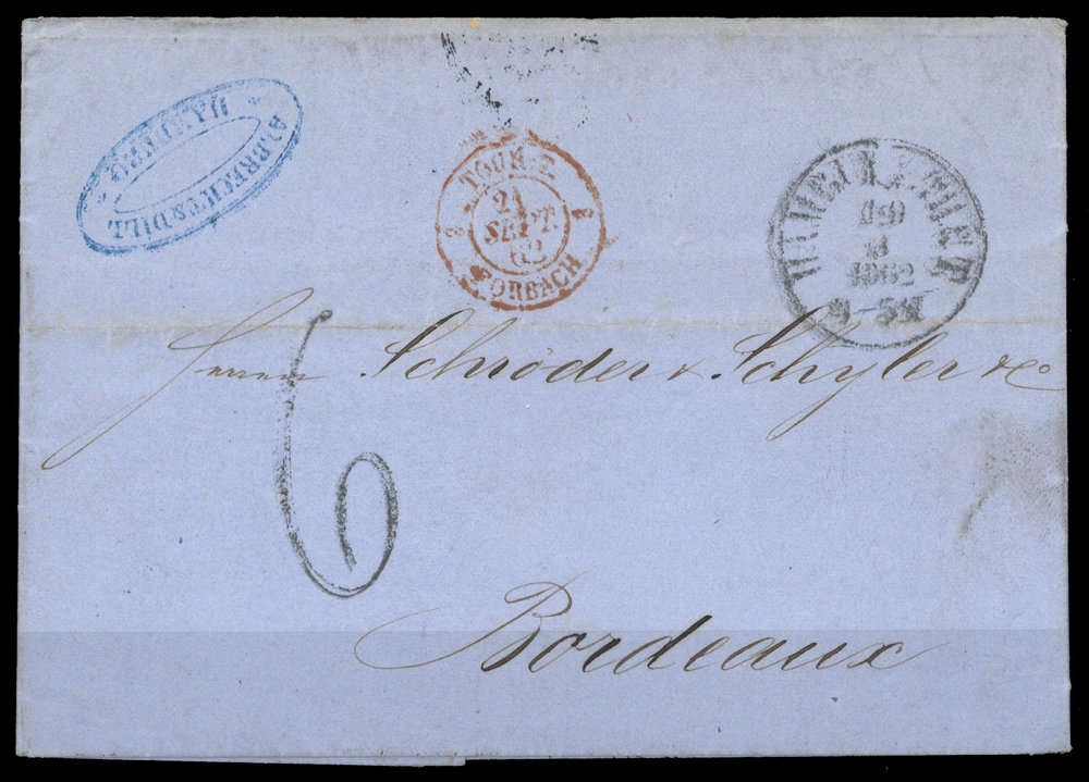 "HAMBURG.TH.&T. 19/9 (1862)", K1 auf Brief mit Inhalt, waager. Faltung, roter Grenz-K2 "FORBACH 21 SEPT 62", "6" Decimen, Altersspuren, nach Bordeaux