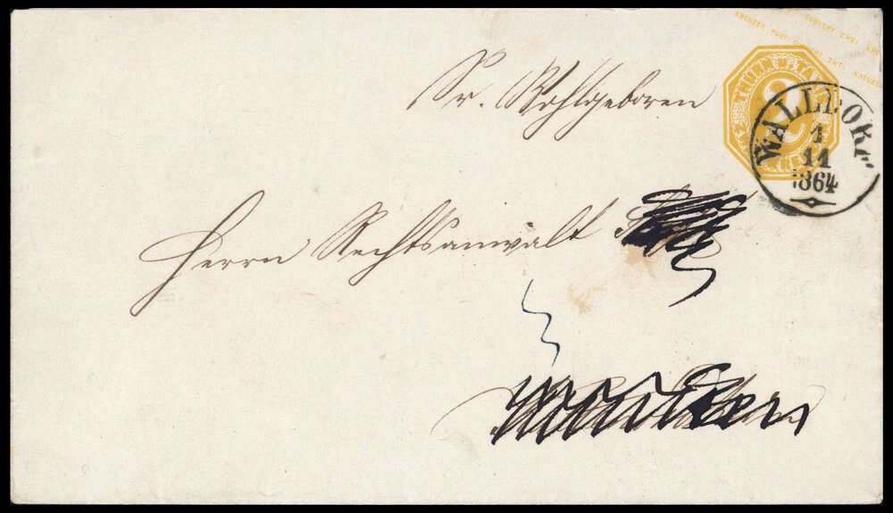 "WALLDORF 1 11 1864", deutlicher K1 auf 2 Kr gelb, GSK (achteckig), Beförderungs- Alters-, rs. Papierfalzspuren, Name und Ort unkenntlich gemacht, rs. Ak-K1 "(KALTENNOR)DHEIM 2 11 1864"