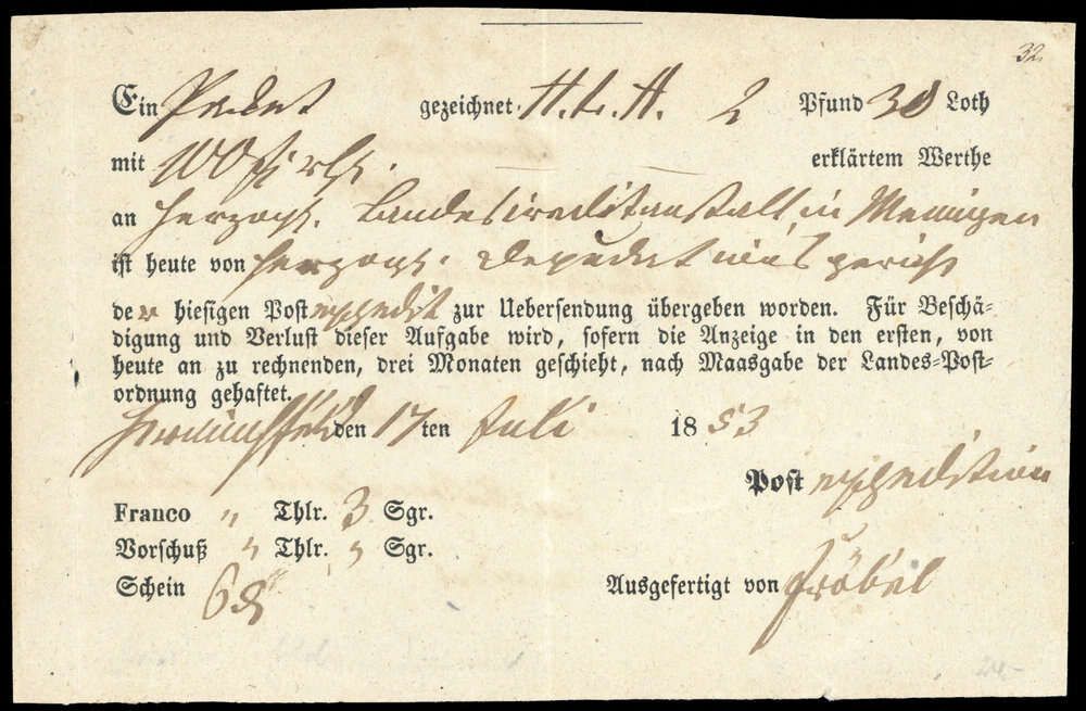 Kranichfeld, hs. auf Postschein für ein Paket nach Meiningen, Faltungen, Gebrauchs- Altersspuren, vo m 17.Juli 1853