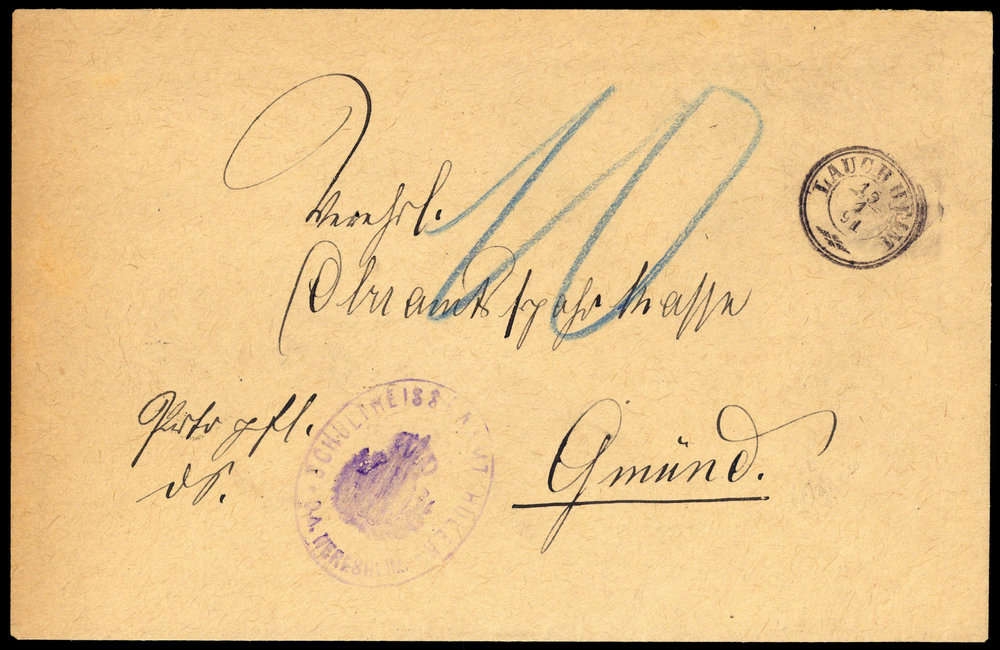 "LAUCHHEIM 191 91" (K2) auf unfrankiertem Brief (SCHULTHEISENAMT) nach Gmünd, rs. Ankunftsstpl., vorderseitig hds. "10", leichte Alterungsspuren.