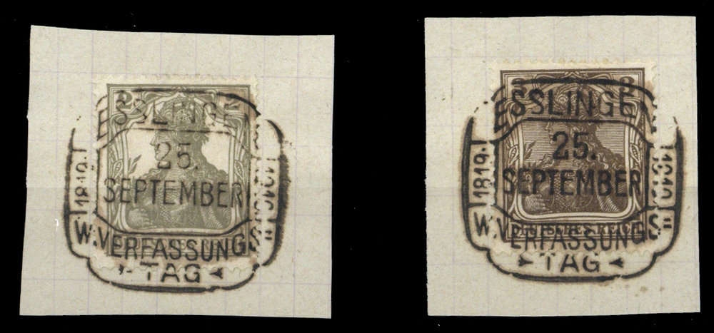 "ESSLINGEN 25. SEPTEMBER 1919 VERFASSUNGSTAG", SST je auf 2 und 3 Pfg. Germania auf Briefstück