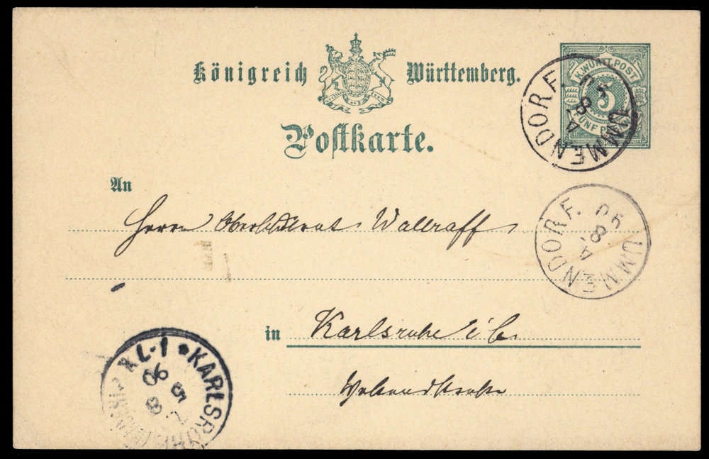 "UMMENDORF 4.8.90" (K1), zweimal auf 5 Pfg. Ziffer-Ganzsache nach Karlsruhe mit Ankunftsstpl.