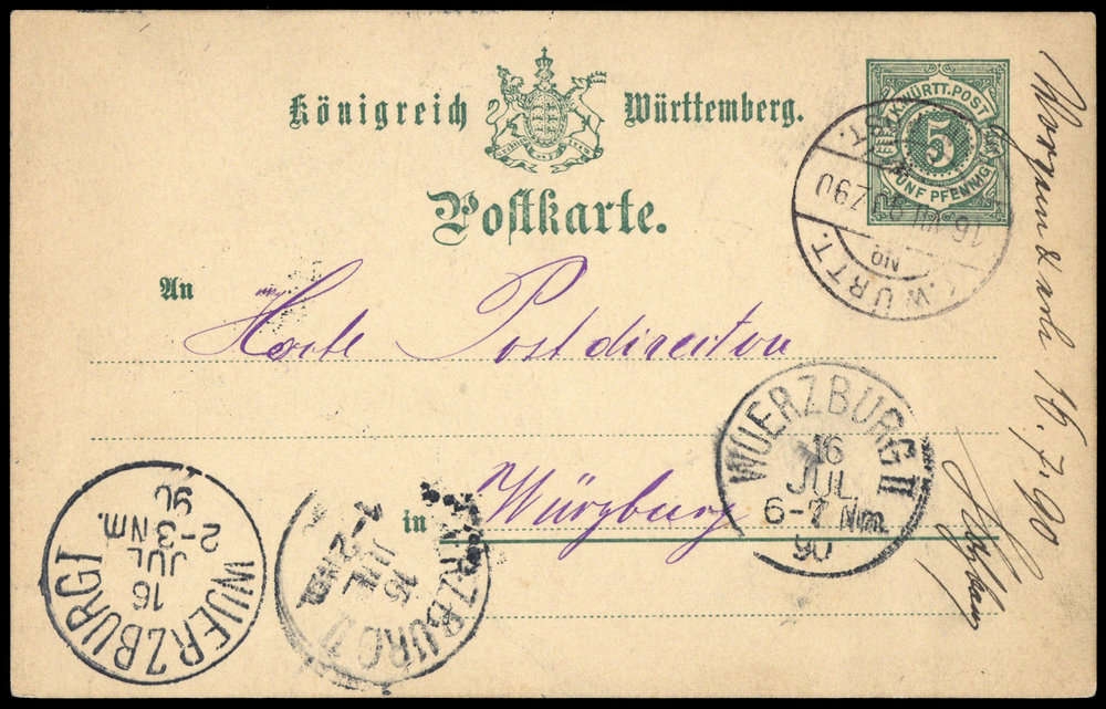 "WÜRTT. 16 VII 90 Z90 BAHNPOST" auf 5 Pfg. Ziffer-Ganzsache nach Würzburg, drei verschiedene Ankunftsstpl., leichte Alterungsspuren.