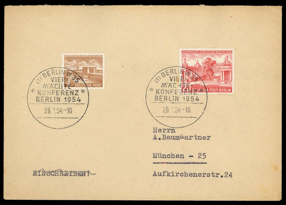 "BERLIN 29.1.1954 - VIER-MÄCHTE-KONFERENZ", zweimal auf Kuvert mit Nr. 112+116 frankiert, adressiert nach München, Alterungsspuren.