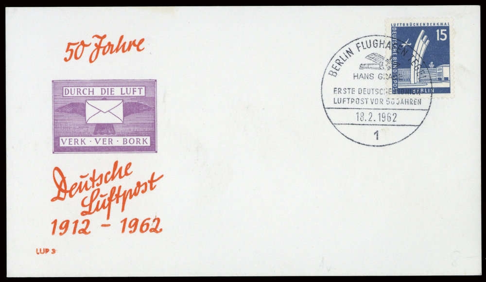 "BERLIN FLUGHAFEN 18.2.1962 HANS GRADE . 1. Deutsche Luftpost vor 50 Jahren" auf passender Schmuckkarte mit Nr. 145 frankiert.