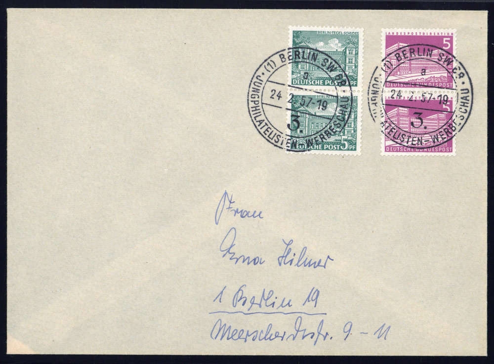 "BERLIN 24.2.1957 - JUNGPHILATELISTEN-WERBESCHAU", zweimal auf Brief mit senkrechtem Paar Nr. 44+141 frankiert, adressiert nach Berlin.