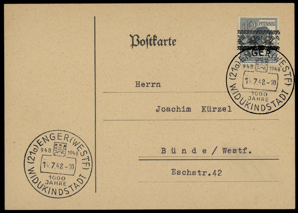 "ENGER (WESTF) 14.7.1948 - 1000 JAHRE WIDUKINDSTADT", zweimal auf Postkarte mit Nr. 40I frankiert, adressiert nach Minden, links kleiner Einriss