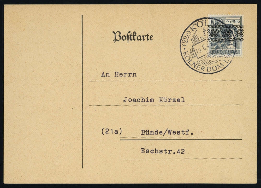 "KÖLN 15.8.1948 KÖLNER DOM" auf Postkarte mit Nr. 40I frankiert, adressiert nach Bünde / Westfalen