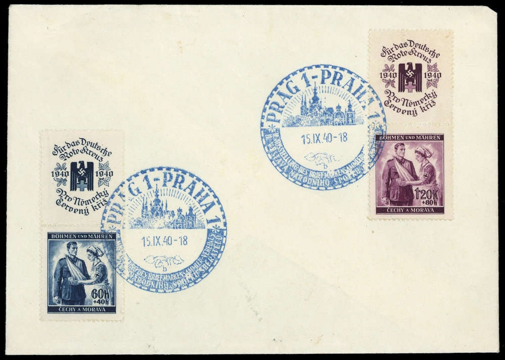 "PRAG 15.9.1940 - BRIEFMARKENAUSSTELLUNG" (blau) zweimal auf Brief mit Nr. 53+54 inkl. oben anhängendem Zierfeld frankiert