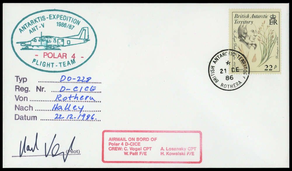 "B.A.T.ROTHERA 21 DE 86", K1 auf 22 P Hooker auf Umschlag mit grünem Ovalstempel "ANTARKTIS-EXPEDITION ANT-V 1986/87 POLAR 4 FLIGHT TEAM", mit Signatur des Piloten
