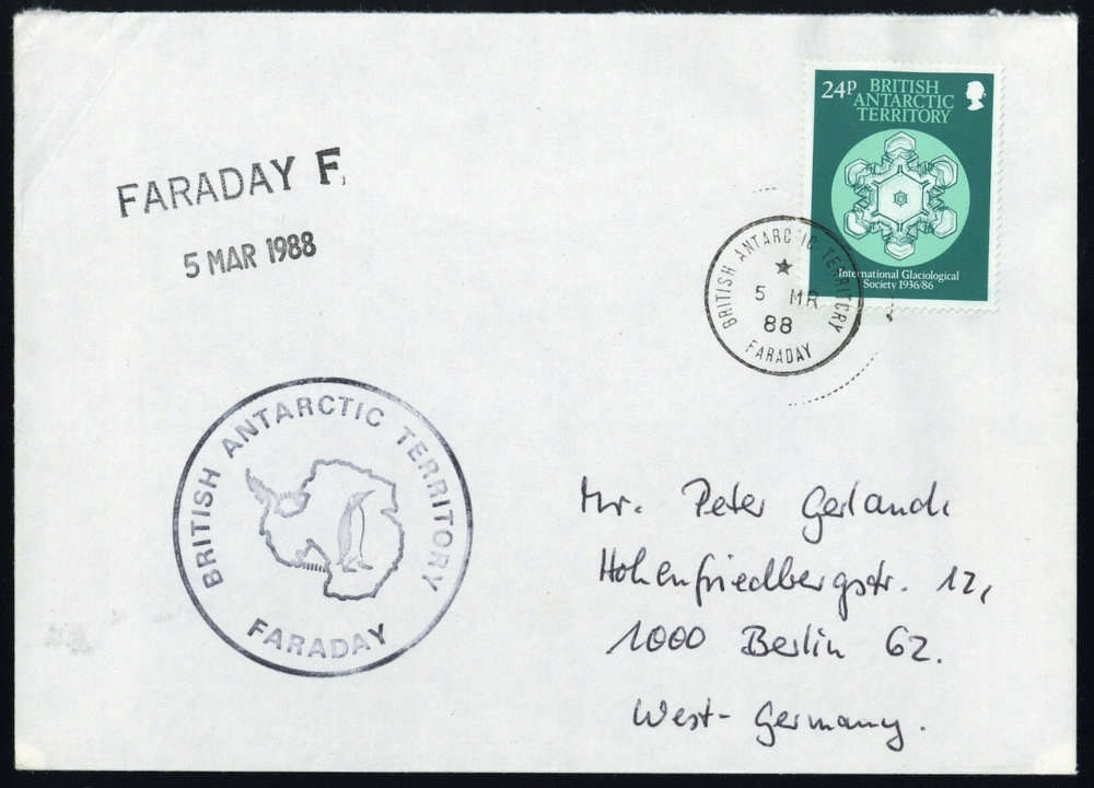 "B. A. T. 5 MR 88 FARADAY", K1 auf 24 P Kristalle, dto. Best.Stpl. + L2 "FARADAY F 5 MAR 1988", Brief nach Berlin
