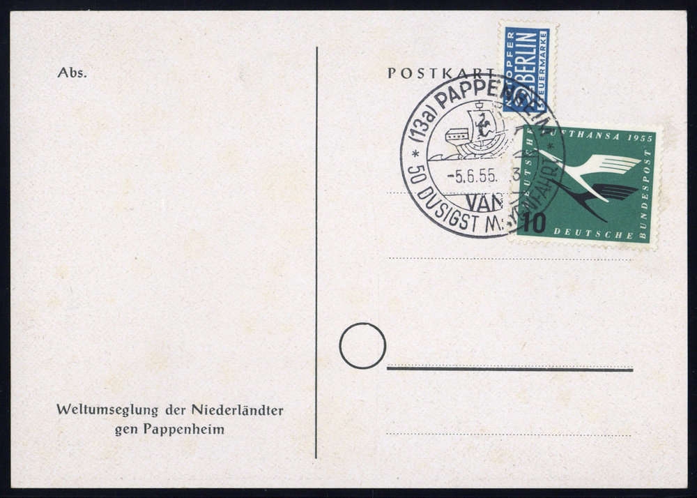 "PAPPENHEIM 5.6.1955 - 50 DUSIGST MAYENFAHRT" auf farbiger Sonderkarte (Weltumseglung der Niederländer gen Pappenheim) mit Nr. 206 und 2 Pfg. Notopfer Berlin.