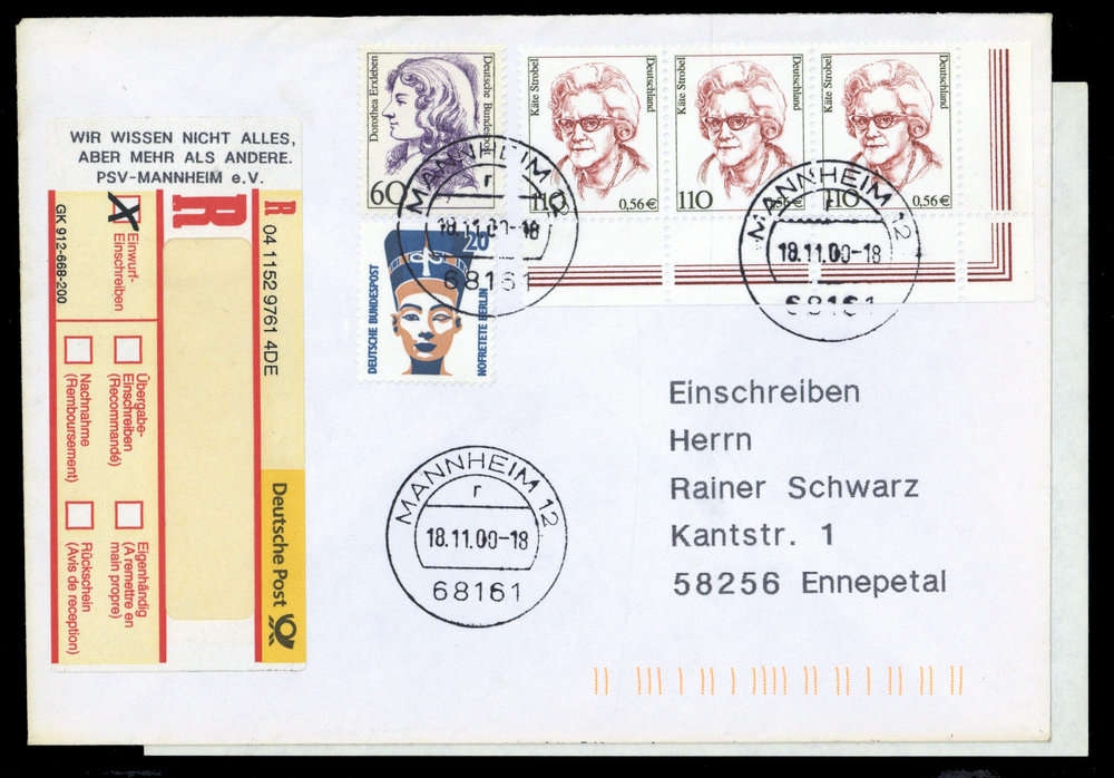 "WIR WISSEN NICHT ALLES, ABER MEHR ALS ANDERE / PSV-MANNHEIM e.V." auf Brief von MANNHEIM 18.11.2000 mit u.a. Eckrand-3er-Streifen rechts unten Nr. 2150 frankiert, adressiert nach Ennepetal mit Einlieferungsbeleg