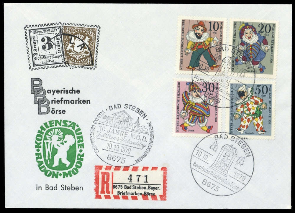 "R 471 8675 Bad Steben, Bayer. Briefmarken-Börse" auf passendem Schmuckkuvert mit BERLIN Nr. 373-376 frankiert mit entsprechendem SST "BAD STEBEN 10.10.1970", keine Empfängeradresse.