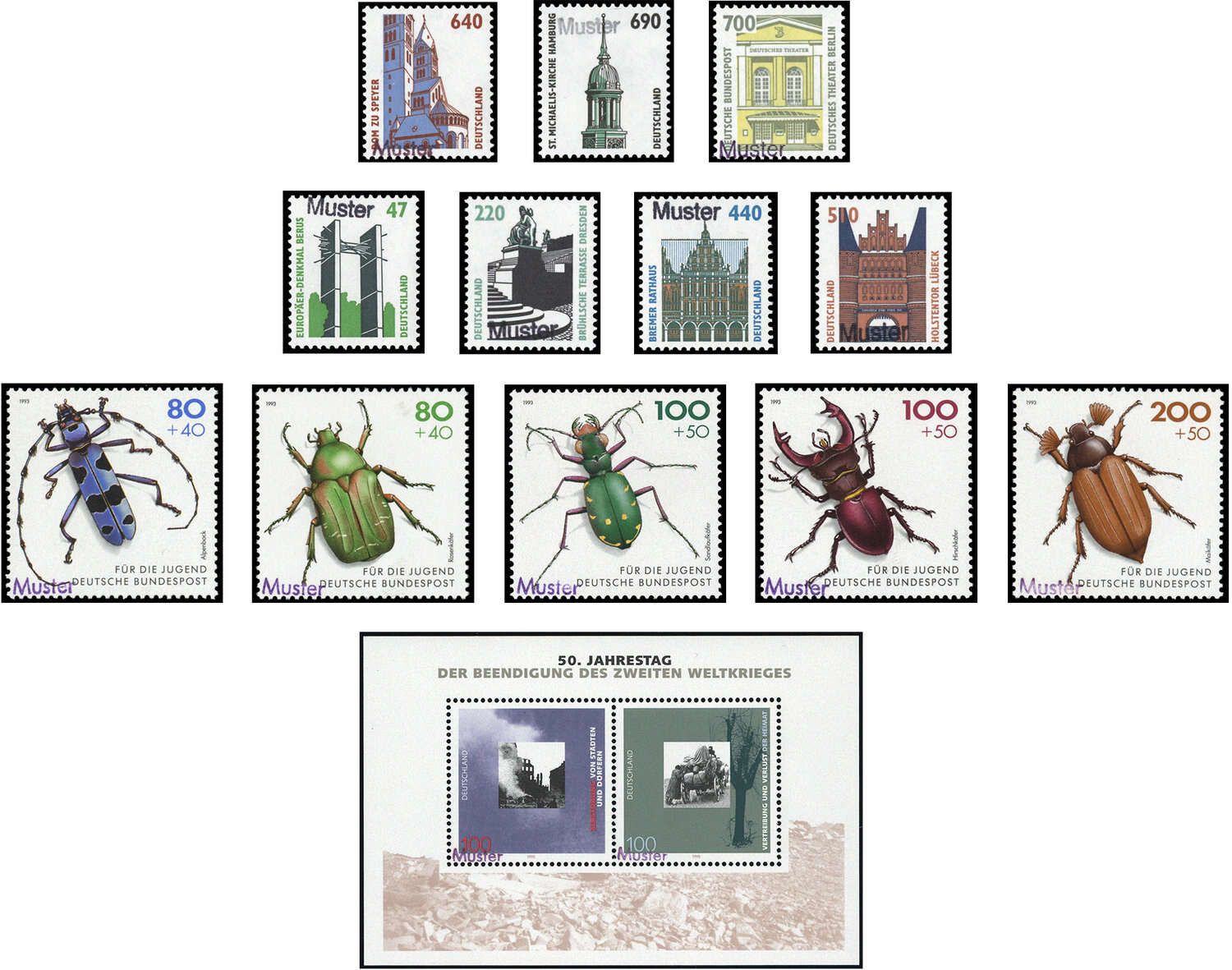 BUND MUSTERMARKEN: Fast 300 verschiedene postfrische Ausgaben mit Aufdruck "Muster" aus dem Zeitraum 1993 bis 1997. Über weite Strecken komplett, dabei sind auch komplette Sätze, Dauerserien, 14 Blockausgaben und 1 Markenheftchen beinhaltet. Eine interessante Bereicherung jeder Bundesrepublik Sammlung mit diesen nicht alltäglichen Ausgaben, welche offiziell nur an wenige Personen, u.a. zu Pressemitteilungen zugesendet wurden.