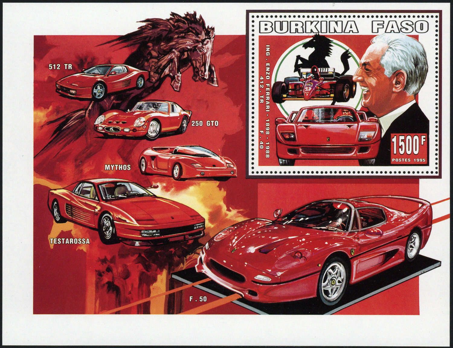 BURKINA FASO: 2.000 Blockausgaben Enzo Ferrari mit Ferrari-Sportwagen "512 TR", "250 GTO", "Mythos", "Testarossa" und "F 50" als gezähnte Blocks in postfrischer Erhaltung (ME 14.000.-)
