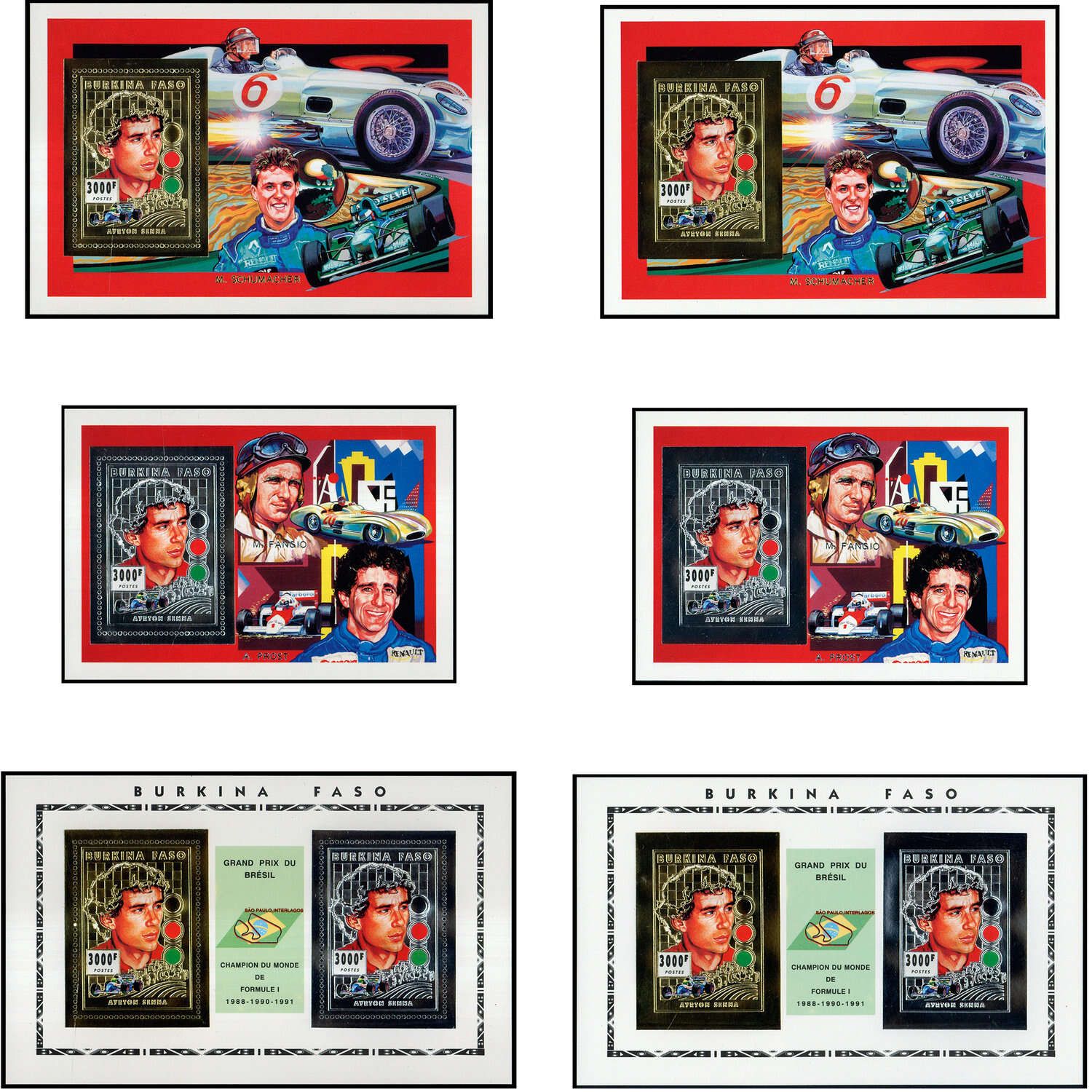 BURKINA FASO: 100 Blockgarnituren Sportler "Ayrton Senna" zu jeweils 6 Stück als ungezähnte und gezähnte Blocks mit silber- und goldfarbenem Papier mit Prägedruck in postfrischer Erhaltung. Zusätzlich 100x Block 157 A+B sowie zusätzlich 400x Block 155+156 A (ME 39.000.-)