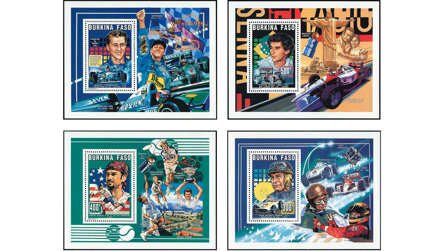 BURKINA FASO: 1.300 Blockgarnituren Sportler Autorennfahrer "Juan M. Fangio", Tennisspieler "Andre Agassi", Rennfahrer "Ayrton Senna" und "Michael Schumacher", je Garnitur 4 gezähnte Blocks in postfrischer Erhaltung (ME 32.500.-)
