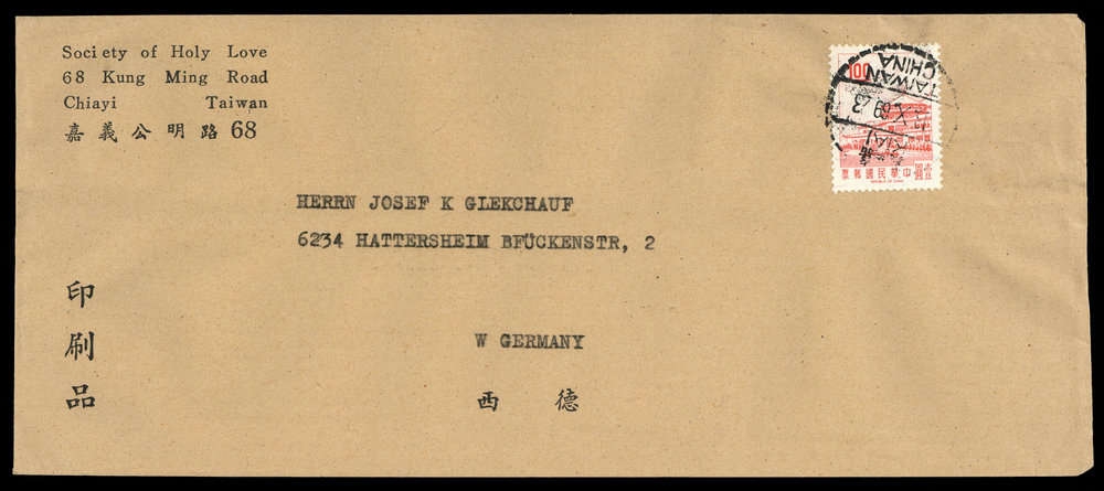 "KIAI (CHIAYI) 13.X.69", DB auf 1 D rot, Umschlag der "Society of Holy Love", nach Deutschland