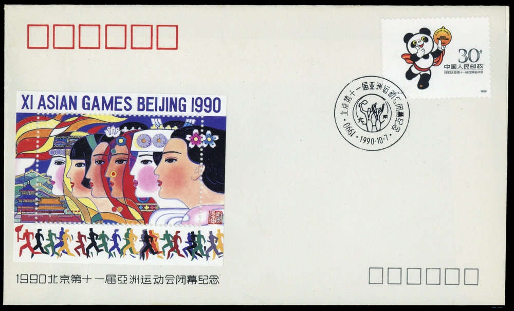 "ASIAN GAMES 1990.10.7" auf 30 F Asienspiele, Umschlag mit Vignettenblock