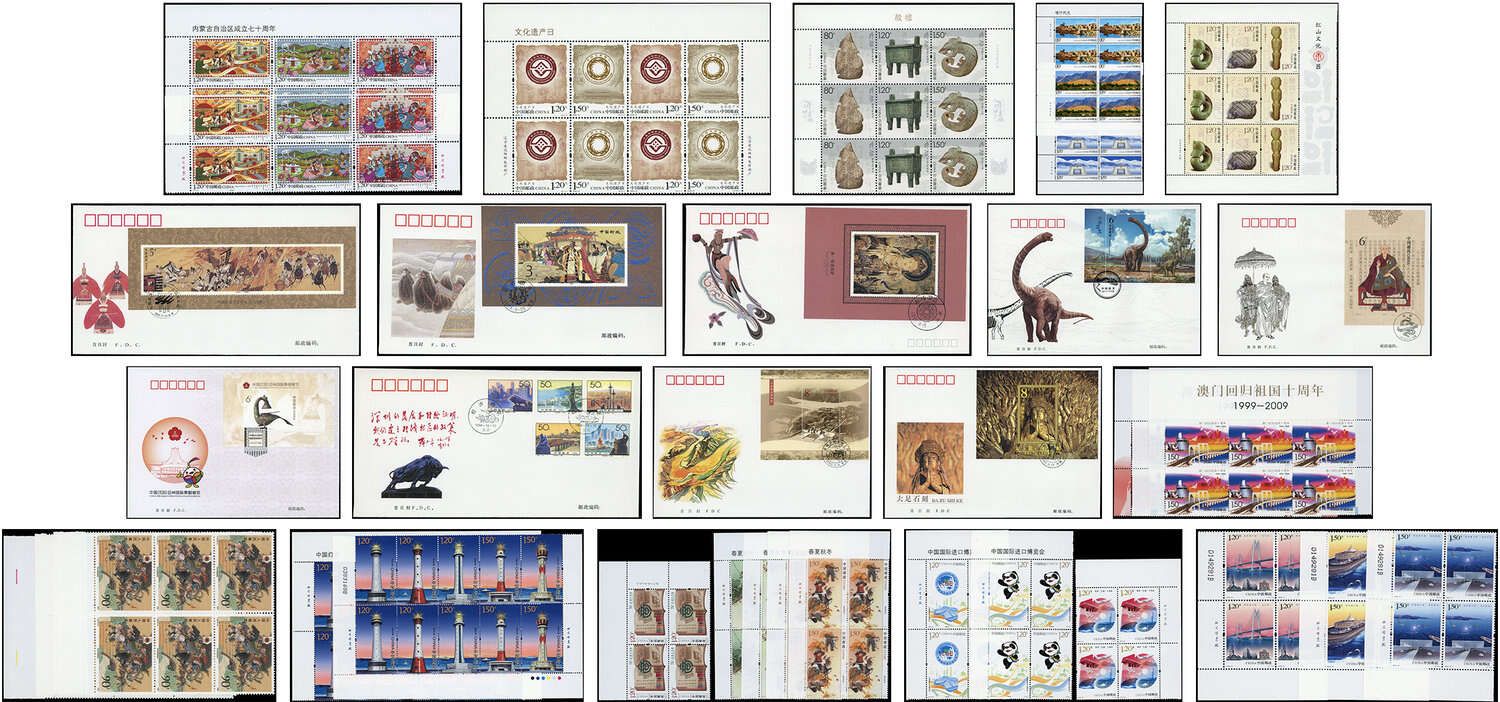 CHINA VR: Drei große Schachteln, dabei umfangreicher Abobestand aus den Jahren 1991-2017 ohne Blockausgaben, teils mehr- bis vielfach geführt, zusätzlich einige frühere Ausgaben, Maximumkarten, Ganzsachen und FDCs mit auch Blockausgaben