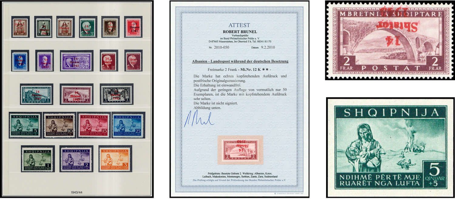 II. WELTKRIEG - ALBANIEN: Nach Hauptnummern komplettes Gebiet sauber postfrisch (MiNr. 1-21) mit dem Wert zu 2 Frank mit der markanten Abart "kopfstehender Aufdruck" in tadelloser postfrischer Luxusqualität. Farbfotoattest Brunel BPP vom 9.2.2010 ohne jegliche Qualitätseinschränkung ".... Die Erhaltung ist einwandfrei. Aufgrund der geringen Auflage von vermutlich nur 50 Exemplaren, ist die Marke mit kopfstehendem Aufdruck sehr selten...". In Anbetracht der bekannten Auflagezahl erscheint der Katalogwert im Michel-Spezial 2023 erhöhenswert! Weiterhin die 5+5 Q. "Hilfe zugunsten der Opfer der Luftangriffe" postfrisch mit der attraktiven Abart "vollständig ungezähnt"